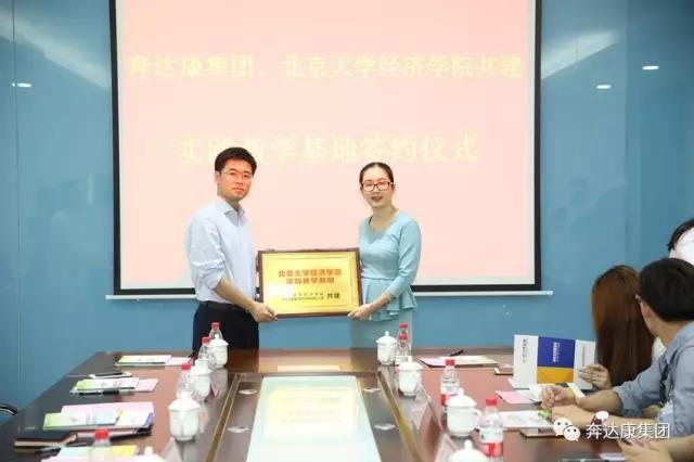 奔达康大学生实习活动已连续成功举办九届暑期和两届寒假实习活动,清华大学、中山大学、暨南大学等近300所高校加入实习活动,从最开始每届提供一百多个实习岗位到后来的四五百个实习岗位,实习规模不断扩大,为众多学子提供了实践锻炼、整合发展的成长机会。在此背景下,奔达康集团与北京大学正式签订实践教学基地协议。火红的签约本象征着奔达康实习公益活动的又一次壮大,也预示着奔达康与北京大学千里相聚的缘分和情谊。为表达校方对于奔达康的感谢及肯定,张洪峰书记特意从北大带来一份精美的纪念礼物赠送给奔达康集团,并正式授予奔达康集团“北京大学经济学院实践教学基地”牌匾。