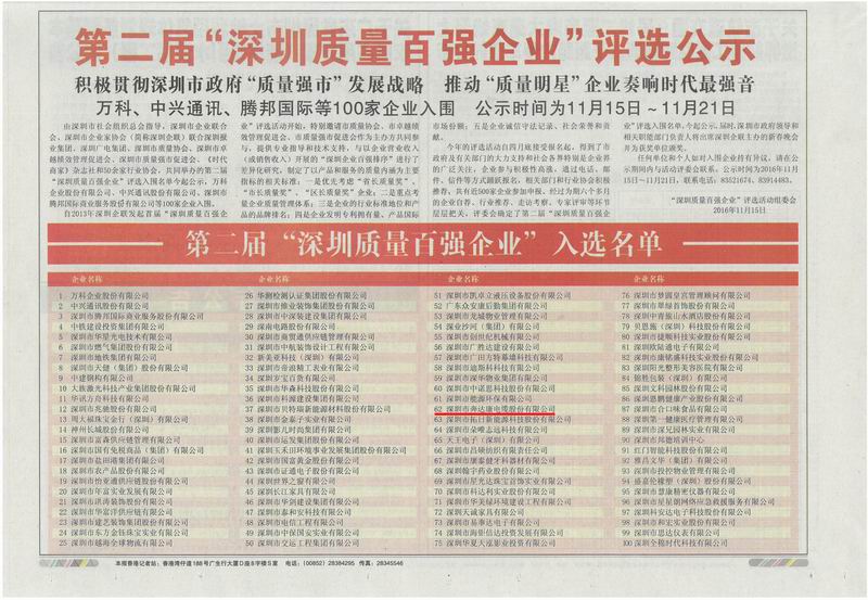 热烈祝贺深圳市奔达康电缆股份有限公司入选2016年“深圳质量百强企业”
