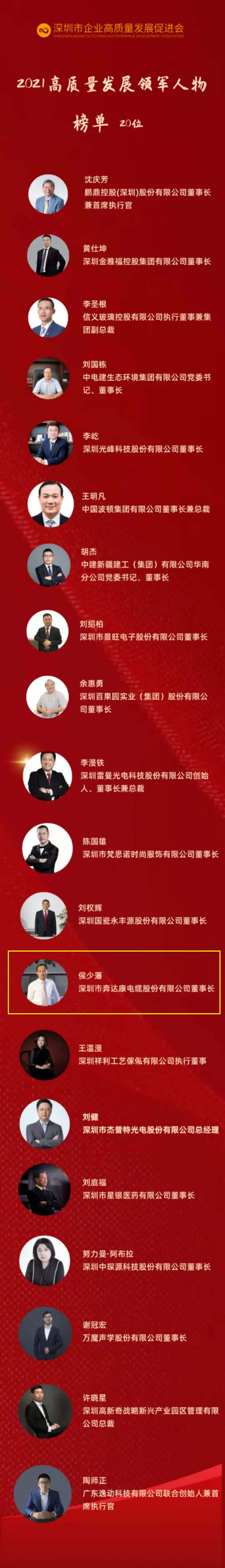 奔达康集团董事长侯少藩获评“2021高质量发展领军人物”。