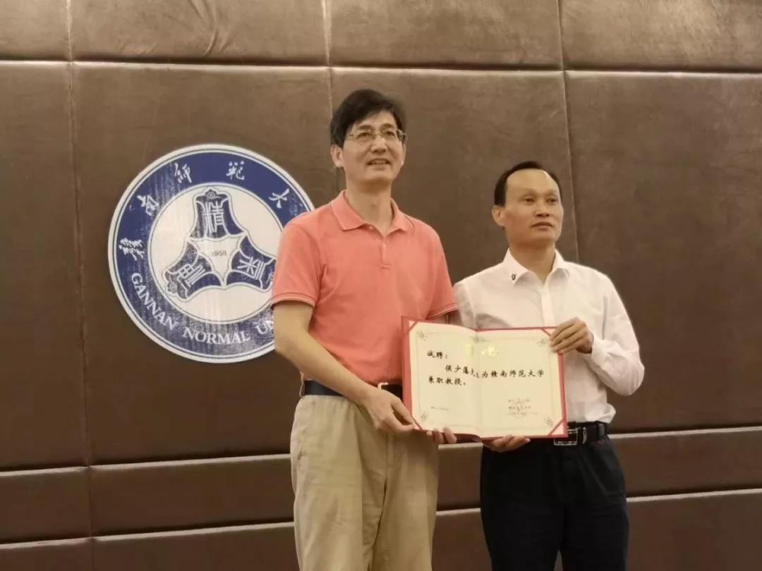 在授聘仪式上,李自茂院长为侯少藩董事长颁发赣南师范大学兼职教授聘书。从李自茂院长手中接过聘书,侯少藩董事长自此在广东金融学院客座教授、金融硕士生导师外多了一种社会身份——赣南师范大学兼职教授,此后侯少藩董事长将尽自己所能,为赣南师范大学学生发展出一份力。