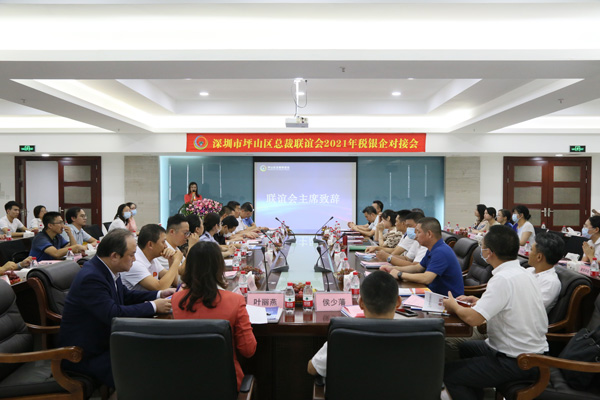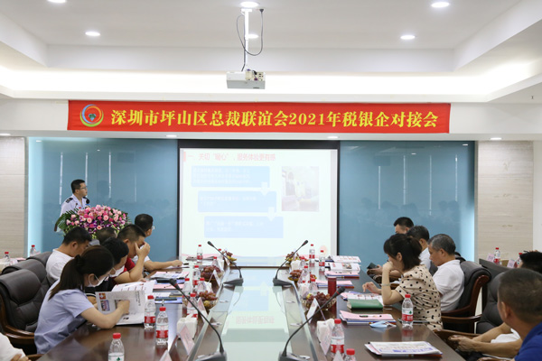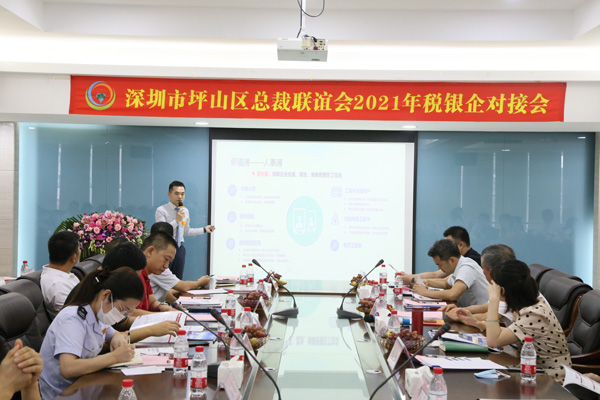 2021年7月29日,深圳市坪山区总裁联谊会2021年税银企对接会在由主席单位免费提供的奔达康集团三楼圆形会议室顺利召开,本次会议由总裁联谊会常务副秘书长覃梦主持。坪山区税务局叶丽燕局长,招商银行坪山支行涂科行长,浙商银行坪山支行陈祥义行长,坪山区总裁联谊会主席、奔达康集团董事长侯少藩,特邀嘉宾广东工贸发展促进会侯晓全会长、深汕实业集团有限公司范景财总经理,以及税务局、银行单位各位领导和应邀的全体联谊会会员朋友出席本次对接会,资源共享,信息共享,共创未来!